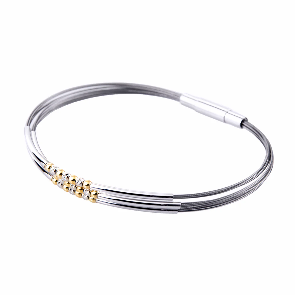 Stylowa bransoletka wykonana ze srebra i stalowych linek w eleganckim, szarym odcieniu. Ozdobiona drobnymi, matowanymi i pozłacanymi elementami, które tworzą harmonijną kompozycję pełną blasku i finezji. Jej minimalistyczny, a zarazem wyrafinowany design sprawia, że doskonale podkreśla charakter każdej stylizacji. Do kompletu dostępna jest kolia utrzymana w tym samym, spójnym wzorze.
