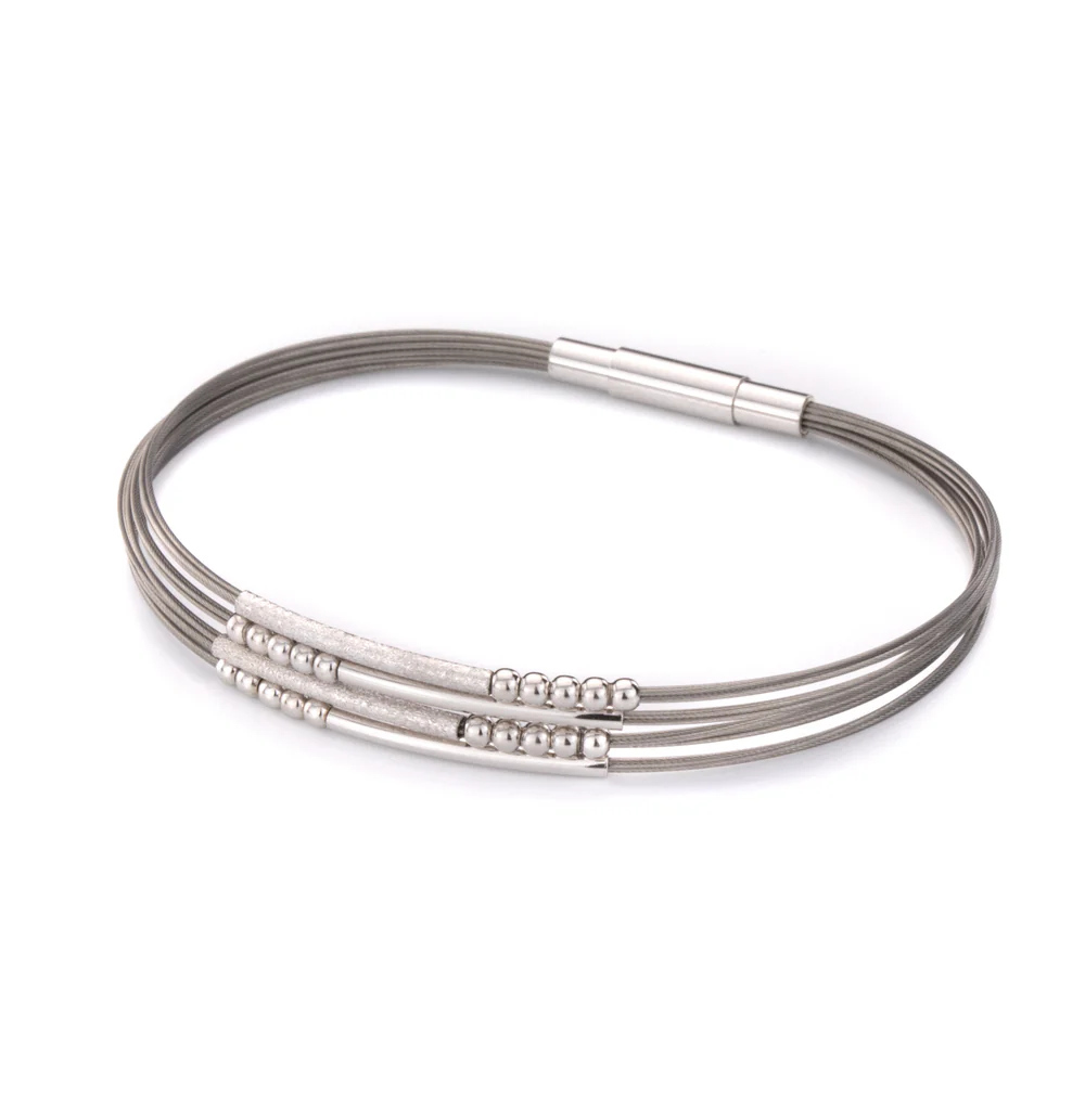 Stylowa bransoletka wykonana ze srebra próby 925 i stalowych linek w eleganckim, szarym odcieniu. Ozdobiona drobnymi, matowanymi i rodowanymi elementami, które tworzą harmonijną kompozycję pełną blasku i finezji. Jej minimalistyczny, a zarazem wyrafinowany design sprawia, że doskonale podkreśla charakter każdej stylizacji. Do kompletu dostępna jest kolia utrzymana w tym samym, spójnym wzorze.